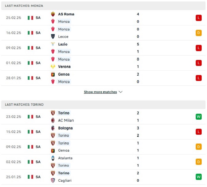 Phong độ gần đây Monza vs Torino